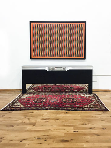 Ideologica loop is focuses to dissect and reprocess the mechanisms and languages used by totalitarian structures, to reveal the atrocities behind war and just as propaganda tries to influence collective psychology by diffusing an artificial perception of reality, so in this installation offers us the almost domestic image of a photo in the wall, a radio with flashing red light, a mirror and a carpet. The image seems at first sight a familiar, serene representation of a normal sitting-room, but it actually hides a message of terror and persecution, inspired by the attack against music which all totalitarian regimes, both past and present, have had in common.
