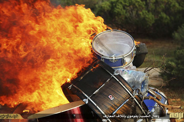 If we get closer to the photograph which, from a distance, resembles the weave of an oriental carpet, we discover that it has been composed of looped repetition of an image showing musical instruments burnt by Islamic State militants. The flashing red light transmits in Morse code the name of Ayham Hussein, a fifteen-year-old Iraqi boy executed for listening to western music. In the distance, confused with other noises (sounds from ISIS propaganda video), the radio broadcast Jazz music, the object of censure by the ‘30s Nazi regime. The mirror places viewer inside the installation, forcing them to choose whether to lower their head and take comfort in the reflection of an individual vanity, or to try and discover the reality beyond appearances.